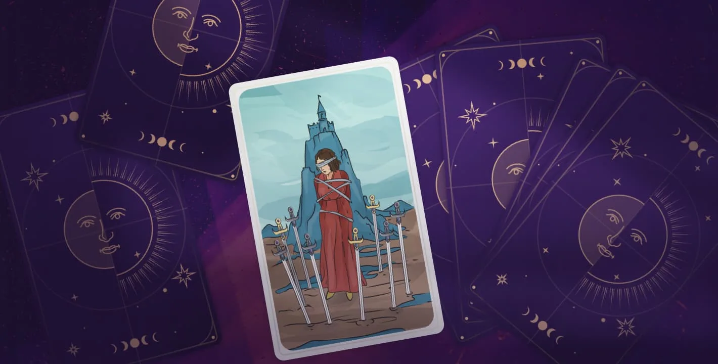 Showing a tied and blindfolded woman, the Eight of Swords doesn’t seem to have the most positive approach in interpretation. She’s surrounded by eight swords, meaning she can’t really move. However, there’s an escape route around them.