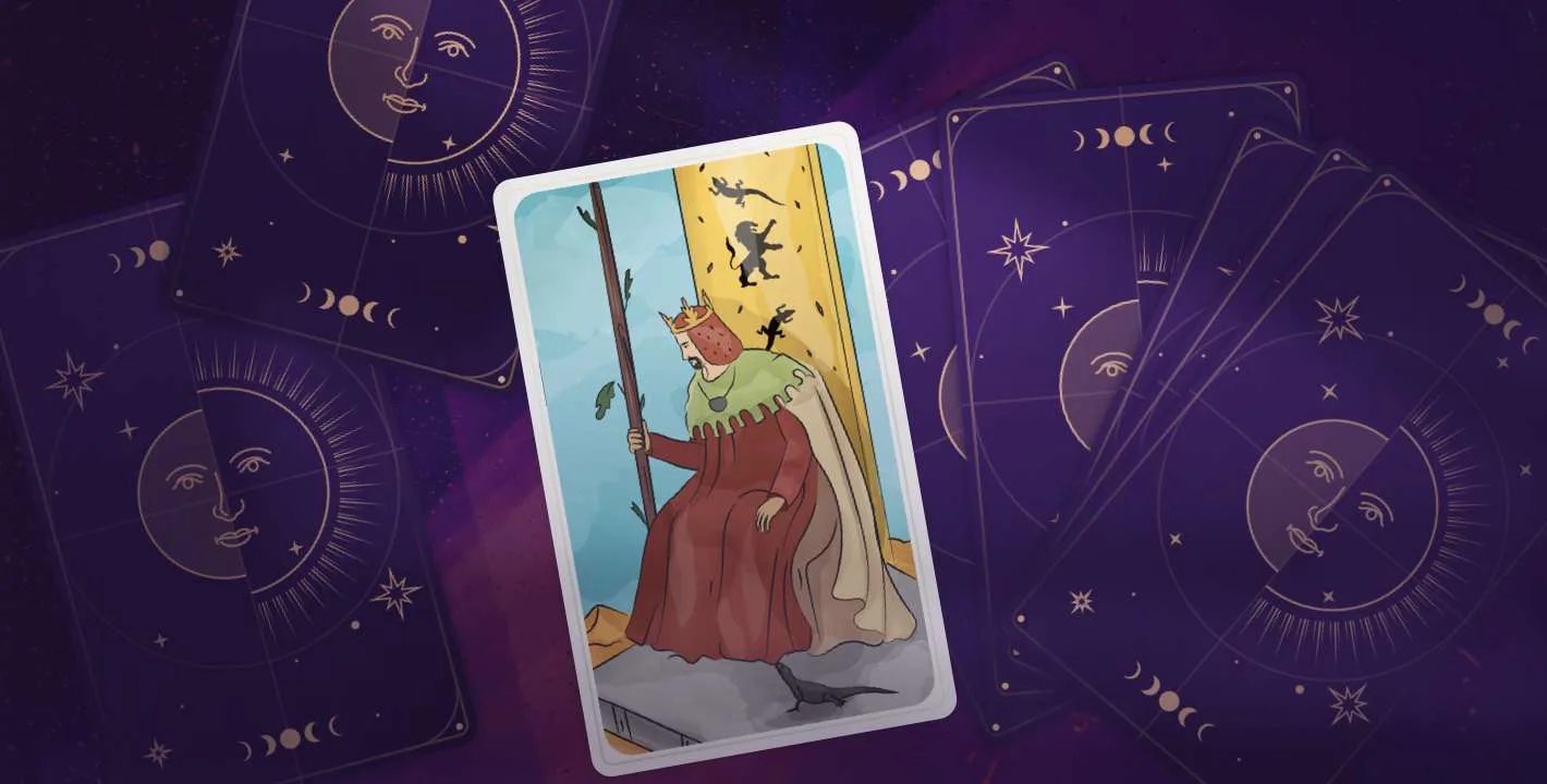 By number, the King of Wands is the last card in the set. It shows a man with a wand. It’s about passion, as well as creativity in life. His outfit features lion and salamander motifs, which underline a significant strength and fire.
