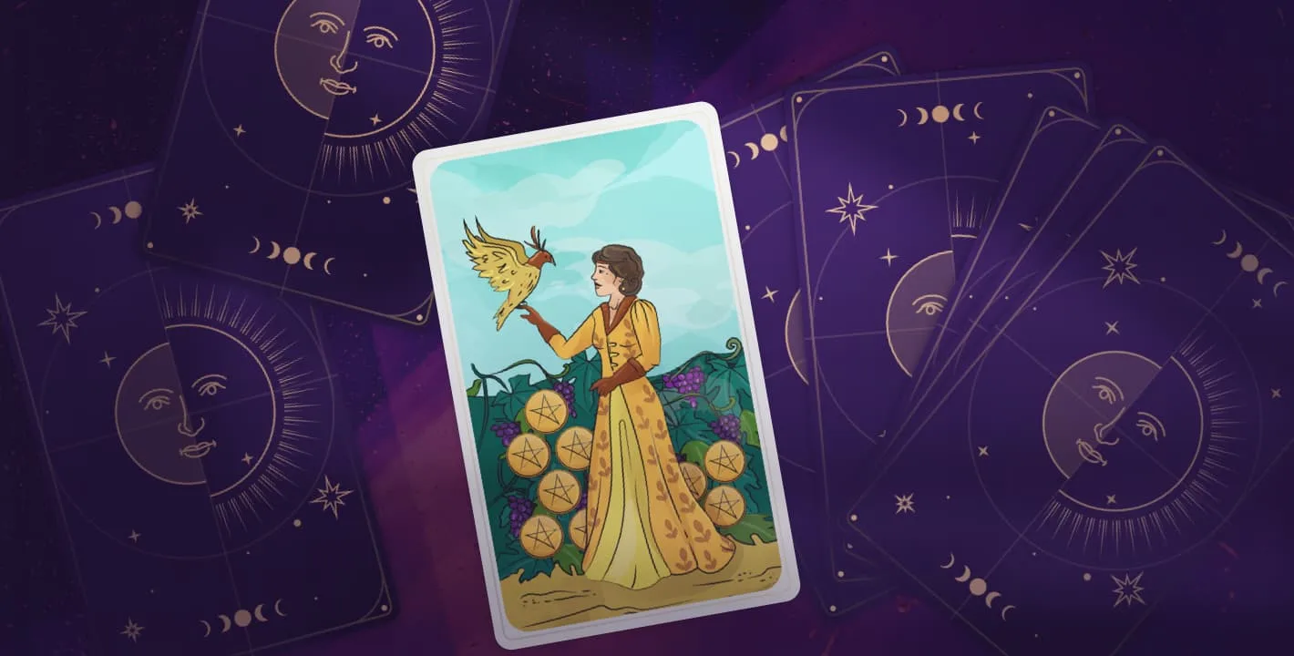 The vineyard indicates wealth, especially since they’re full of grapes, not to mention the coins. But what does that mean for you? Let’s see all the possible interpretations of this card in different positions and types of reading.