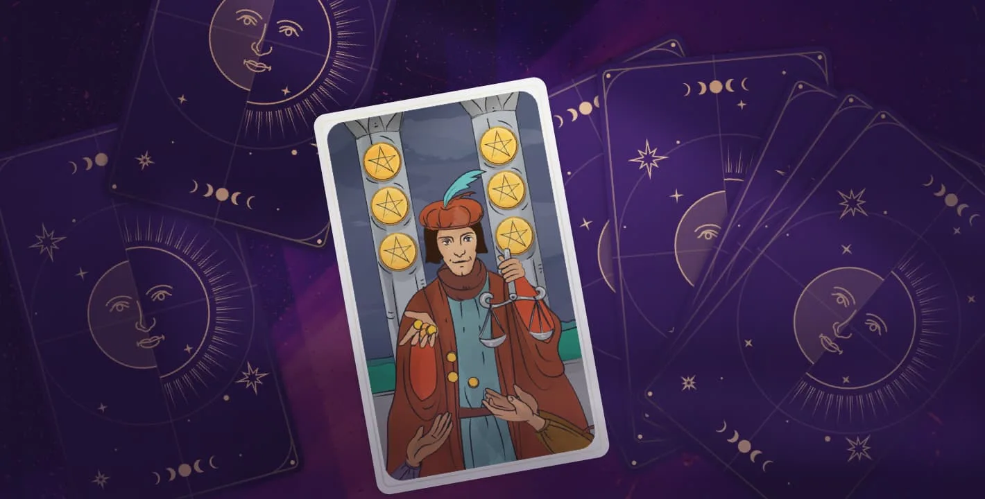 Depicting a man wearing the color of wealth, purple, the Six of Pentacles is often associated with wealth. It shows him giving money to two beggars. He has a scale on his hand, which suggests that what goes around comes around. It’s about being fair and accepting karma, as it may hit you out of nowhere.