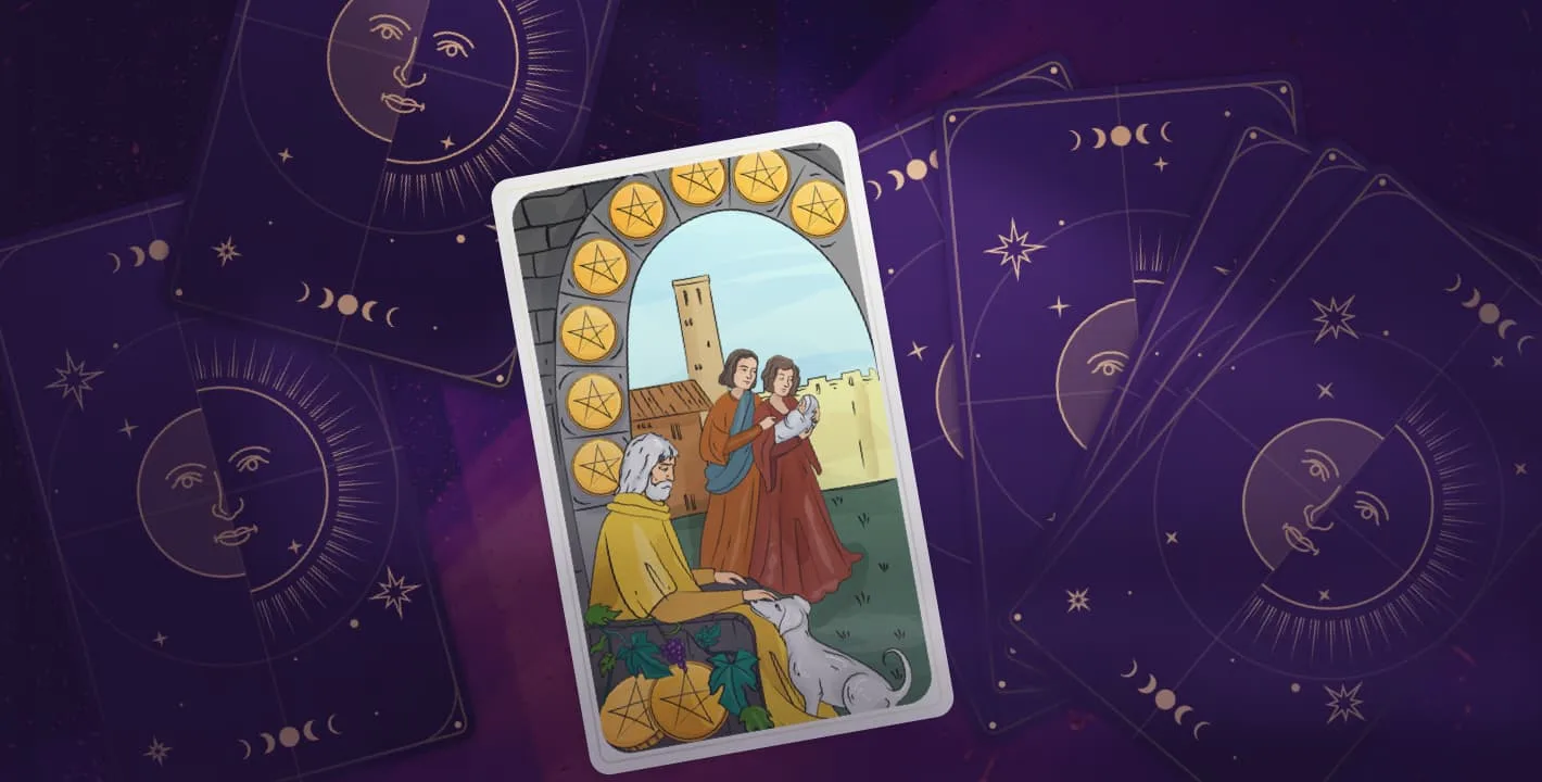 At first glance, the Ten of Pentacles shows love and wealth. The card depicts an old man surrounded by family and pets in the middle of an archway. As you look through the archway, you can see a beautiful estate. His robe has motifs of grapevines.